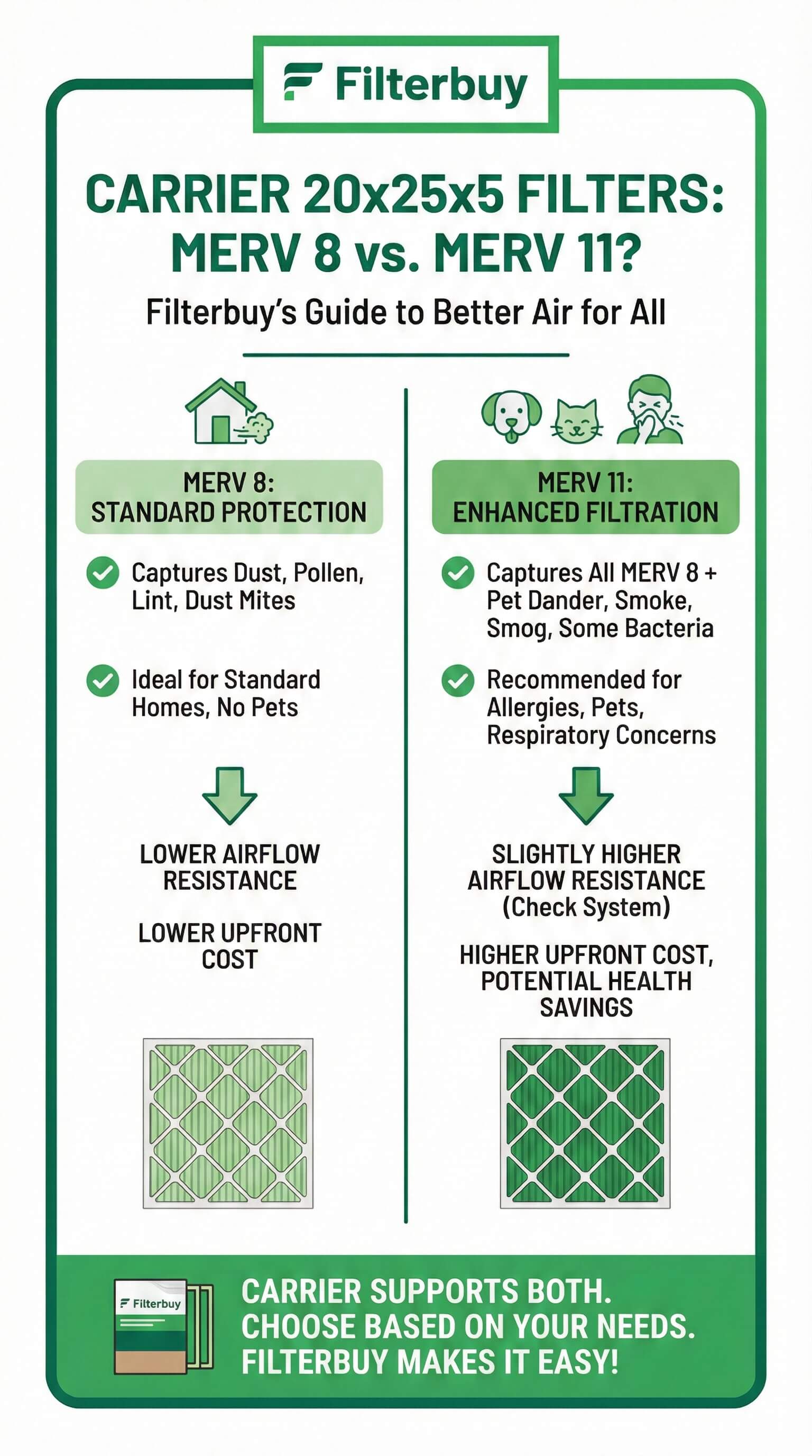 Ready to breathe easier with the perfect MERV-rated filter for your Carrier 20x25x5 system? Shop Filterbuy's complete selection of American-made filters in MERV 8, 11, and 13 ratings—all backed by our commitment to Better Air For All.